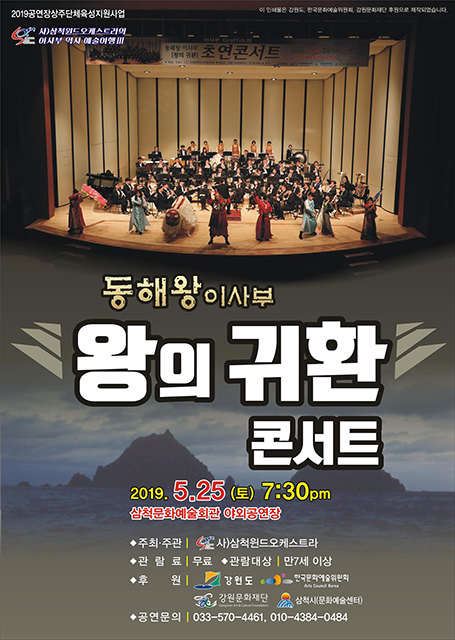 삼척시가 2019년 공연장 상주단체육성지원사업의 일환으로 오는 25일 오후 7시 30분 삼척문화예술회관 야외공연장에서 이사부 ‘왕의 귀환’ 콘서트를 개최한다.