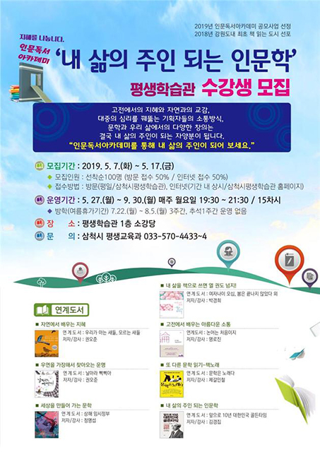 삼척시 평생학습관은 인문독서아카데미 ‘내 삶의 주인 되는 인문학’ 수강생을 오는 17일까지 모집한다.