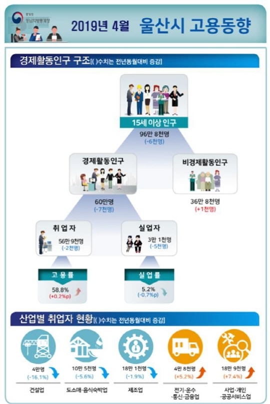 울산의 경우 4월 취업자는 56만9000명으로 전년 동월 대비 2000명(-0.3%) 감소했지만 경제활동인구가 7000명이 줄어 고용률은 58.8%로 0.2% 상승했다.