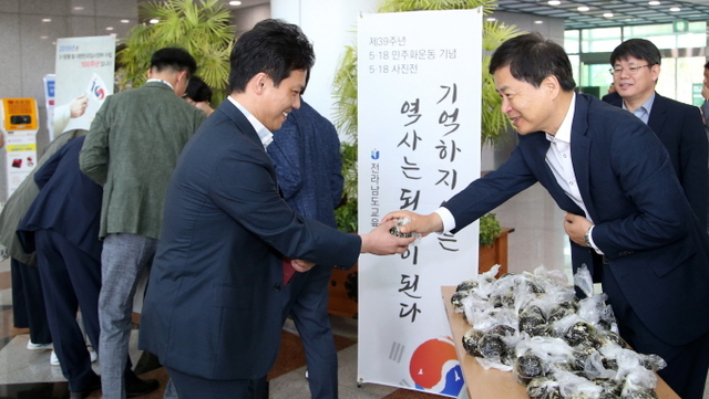 도교육청도 5‧18민주화운동의 역사를 이해하고 그 정신을 계승‧실천하기 위해 15일 오전 본청 직원들을 대상으로 주먹밥 나누기 행사를 실시했다. 더불어 5‧18의 역사를 이해할 수 있는 26점의 사진을 본청 현관 및 동편 출입구에 전시하는 5‧18민주화운동 기념 사진전을 열고 있다.