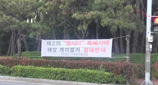 수영발전협의회 명의로 걸린 현수막에는 '교통대란, 미세먼지, 소음, 공해 유발시키는 해상케이블카 절대반대', '제2의 엘시티 특혜사태 해상케이블카 절대반대' 등 해상케이블카 사업이 '제2의 엘시티' 사업이라며 반대 운동에 동참했다.