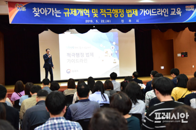 경남 진주시는 지난 22일 시청 시민홀에서 시 공무원 150여명을 대상으로 ‘찾아가는 규제개혁 및 적극행정 법제 가이드라인 교육’을 실시했다.