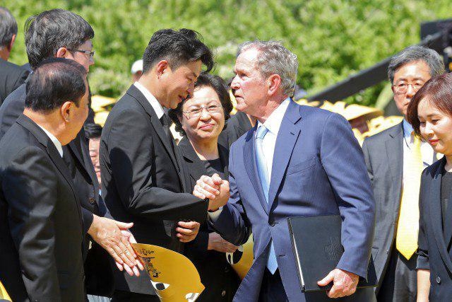 ▲ 부시 전 미국 대통령이 23일 오후 경남 김해 봉하마을에서 노무현 전 대통령 서거 10주기 추도사를 마친 뒤 노 전 대통령의 부인 권양숙 여사와 아들 건호 씨와 인사하고 있다.ⓒ연합뉴스