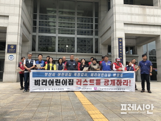 참교육을 위한 전국 학부모회 부산지부, 공공운수노조 부산지역지부는 28일 오전 부산시청 앞에서 기자회견을 열고 "부산시는 어린이집 특정감사, 비리어린이집 비공개 리스트를 공개하라"고 촉구했다.