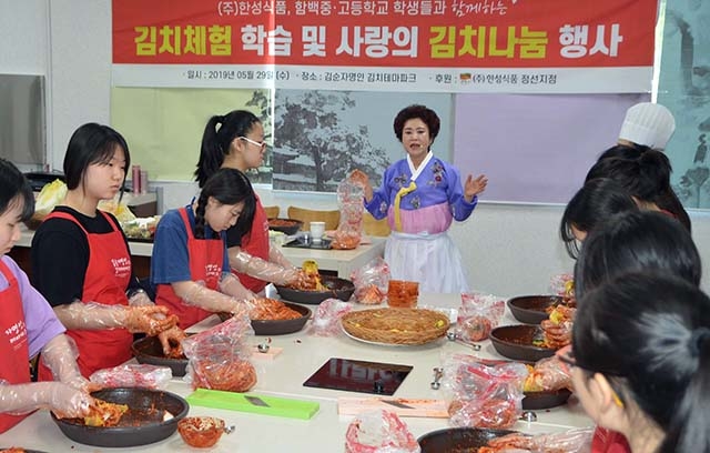 김치전문기업 ㈜한성식품(대표 김순자)이 29일 강원 정선군 신동읍에 위치한 김순자 명인 김치테마파크에서 학생들과 함께 ‘김치 체험 및 사랑의 김치 나눔’행사를 가졌다.