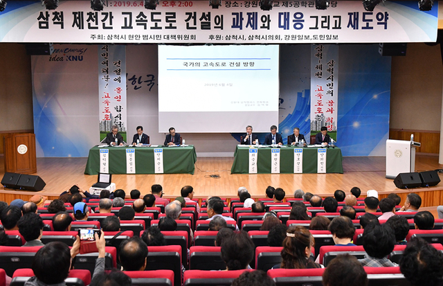 ▲4일 강원 삼척시 강원대학교 삼척캠퍼스 제5공학관에서 삼척 시민이 중심이 되어 동서고속도로 조기 건설 공감대 형성을 위한 ‘삼척~제천 동서고속도로 토론회’가 열리고 있다. 이날 행사는 삼척시 국책 및 현안사업 범시민 대책위원회 주관으로, ‘삼척~제천 고속도록 건설의 과제와 대응 그리고 도약’이라는 주제로 토론회 개최했다. ⓒ삼척시