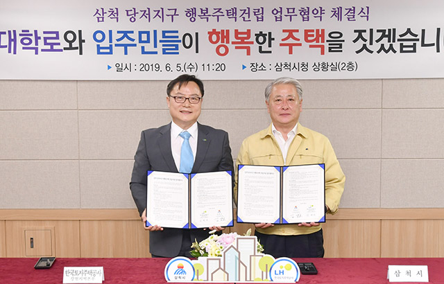 삼척시는 5일 시청 상황실에서 ‘당저지구 행복주택 건립’사업의 원활한 추진을 위해 한국토지주택공사(LH)와 업무협약을 체결하고, 그 동안 침체되어 있던 대학로 활성화를 위한 첫 발을 내딛는다.