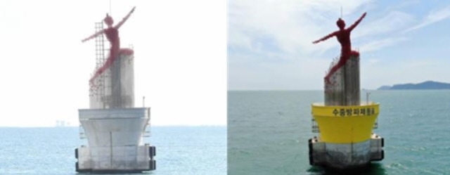 먼저 조형물 기단 콘크리트는 지난 5월 해양수산부에서 제정 고시한 '수중 방파제 항로표지에 관한 기준'에 따라 황색(黃色)으로 페인트를 칠해 기능을 보강하고 기단 상부에 '수중 방파제 등표'라고 글씨를 새겨 조형물의 용도를 쉽게 알 수 있도록 했다.