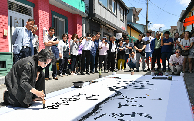 이날 강병인 선생이 골목길 정원박람회 성공개최를 위해 노력하고 있는 지역 주민들의 마음을 담아 바닥에 깔린 화선지 위에 큰 붓으로 ‘골목길 꽃으로 물들다’글씨를 시연하는 퍼포먼스를 펼쳤다.