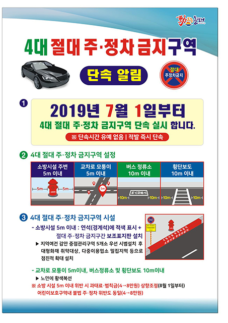 4대 주·정차 절대 금지구역은 소방시설(소화전·급수탑 등) 및 교차로 모퉁이 5미터 이내와 버스정류소 및 횡단보도 10미터 이내 구역이다.