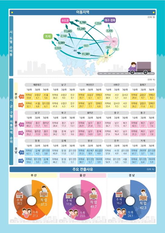 연령대별로는 부산·울산·경남 모두 20~30대 인구 순유출이 많았는데 이는 학업과 취업 등을 이유로 지역을 떠나는 인구가 많은 것으로 분석된다.