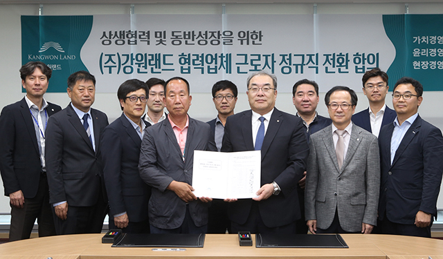 강원랜드는 25일 오후 2시 강원랜드 본사사옥에서 한형민 부사장, 석광산업 근로자대표를 비롯한 노․사․전문가협의기구 위원들이 참석한 가운데 상생협력 및 동반성장을 위한 협력업체 근로자 정규직 전환에 합의하고 합의서를 교환했다.