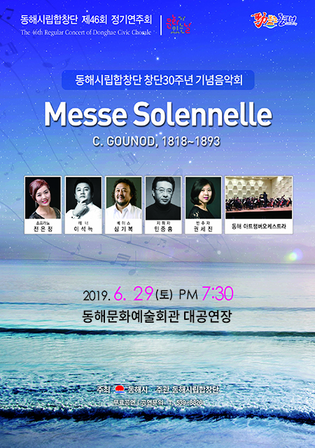 이번 정기연주회는 동해시립합창단(지휘자 민종홍) 창단 30주년을 맞아 고전과 전통미를 느낄 수 있는 전통 합창 명곡 ‘구노의 장엄미사(Messe Solennelle)’를 주제로 아름다운 선율과 감미로운 하모니를 선사할 예정이다.