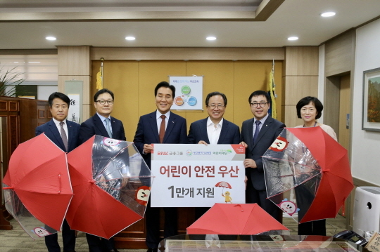 BNK금융그룹은 28일 오후 부산시교육청을 방문해 우천 시 교통사고 예방에 효과가 높은 '어린이 안전 우산' 1만개를 기증했다고 밝혔다.
