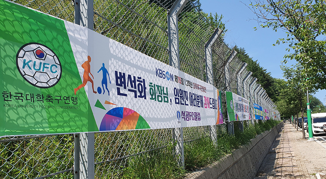 ▲5일 강원 태백시 고원1구장에서 진행되고 있는 ‘KBS N 제15회 1, 2학년대학축구연맹전’ 4일째를 맞은 가운데 참가 선수단과 임원을 응원하는 태백지역 사회단체와 기관 등의 현수막이 경기장 주변에 빼곡하게 부착되어 있다. ⓒ프레시안(홍춘봉)
