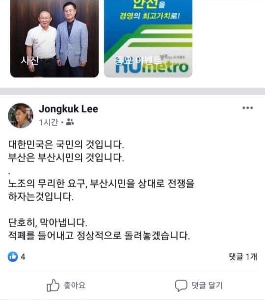 10일 부산지하철노조 등에 따르면 이종국 사장은 이날 오전 자신의 페이스북에 "대한민국은 국민의 것이다. 부산은 부산시민의 것이다"며 "노조의 무리한 요구, 부산시민을 상대로 전쟁을 하자는 것이다"고 노조의 총파업을 비난했다.