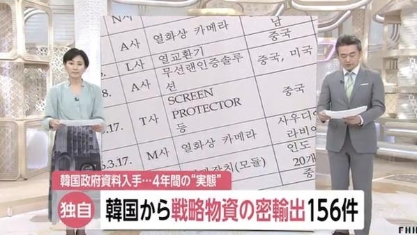<후지TV>는 10일 '한국에서 무기로 전용 가능한 전략물자의 밀수출이 지난 4년간 156차례 적발됐다된 것으로 드러났다'고 보도하며 '단독 입수' 문건을 제시했다. 해당 자료는 한국 사법당국이 전략물자 무허가 수출을 적발한 실적에 관한 것인데, 지난 5월 조원진 의원실의 연도별 전략물자 무허가수출 적발 및 조치현황 요구에 따라 제출된 것이다.
