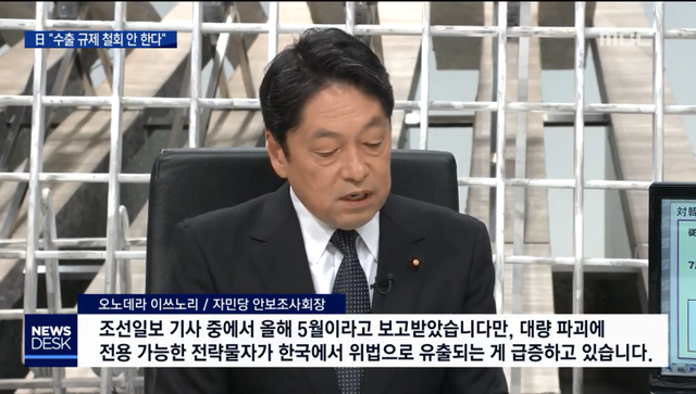 해당 자료는 방위상을 지낸 자민당 오노데라 이쓰노리 안보조사회장이 지난 8일 "<조선일보> 기사 중에서 올해 5월이라고 보고받았는데, 대량 파괴에 전용 가능한 전략물자가 한국에서 위법으로 유출되는 게 급증하고 있다"고 한 발언에서 인용한 것과 동일한 자료로 보인다.