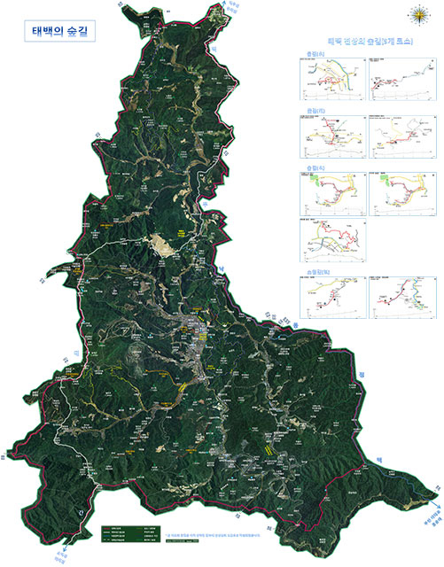 시는 걷기 좋은 천상의 숲길 9개 코스를 우선 선정했다. 숲길 전체지도에는 천상의 숲길을 중심으로 지도상에 표시되지 않은 태백의 다양한 숲길까지 상세히 담겨있다.