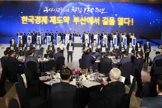 부산상의는 16일 오전 11시 해운대 벡스코 제2전시장에서 '한국경제 재도약, 부산에서 길을 열다'라는 주제로 지역 경제인을 비롯한 지역사회를 대표하는 500여 명이 참석한 가운데 창립 130주년 기념식을 개최했다.