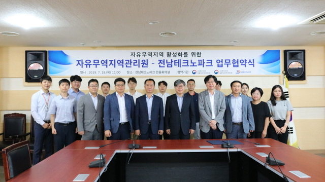 (재)전남테크노파크(원장 유동국)는 18일 전남테크노파크 2층 전용회의실에서 전라남도 자유무역지역 경쟁력 강화를 위해 대불자유무역지역관리원, 율촌자유무역지역관리원과 업무협약을 체결했다고 밝혔다.