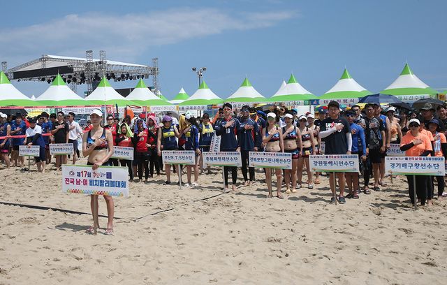 ▲지난 27일 강원 동해시 망상해수욕장 특설 경기장에서 ‘제17회 동트는 동해배 전국 남녀 비치발리볼대회’ 개막식이 진행되고 있다. 대한민국배구협회가 후원하고 있는 이번 대회는 여자 42개팀, 남자 30개팀, 혼성 21개팀 총 93개팀 1000여 명의 선수단이 참여했다. ⓒ동해시
