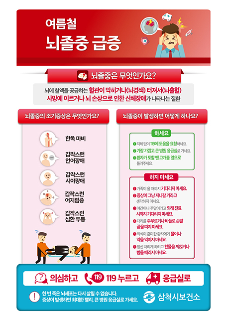건강보험심사평가원의 자료에 따르면 2015년 12월의 뇌졸중 환자수 19만8000명 보다 2016년 기온차가 심한 한여름(7~8월)에 월 평균 20만 명이 넘게 발생한 것으로 나타나 여름철에 적극적인 예방활동이 필요한 실정이다.
