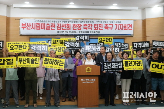 부산예술문화단체총연합회, 부산미술협회, 부산화랑협회 외 31개 미술단체 및 3개 시민단체는 13일 오전 부산시의회 브리핑룸에서 기자회견을 열고 "부산시립미술관 김선희 관장을 퇴진시켜라"고 촉구했다.
