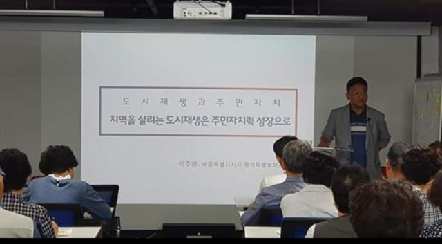 이날 교육과정 소개 후 이주원 세종시 정책특별보좌관이 도시재생 사업의 이해와 주민의 역할 등에 대해 상세히 설명하는 시간을 가졌다.
