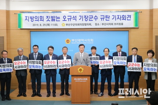 부산시 구·군의회의장협의회는 29일 오전 11시 부산시의회 3층 브리핑룸에서 기자회견을 열고 "군수의 비상식적인 행동으로 군정질문 진행이 중단되는 초유의 사태가 발생한 데 대해 중대 상황으로 규정하고 이를 강력히 규탄한다"고 밝혔다.