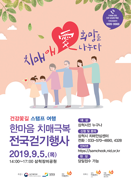 삼척시는 ‘한마음 치매극복 전국동시 걷기행사-치매 애(愛) 희망을 나누다’가 ‘건강 꽃길 스탬프 여행’이라는 부제로 오는 5일 오후 2시 삼척장미공원에서 개최된다고 밝혔다.