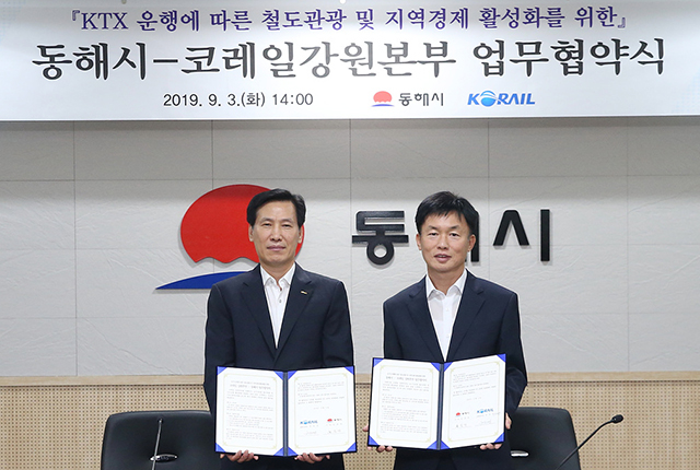 이날 협약은 오는 12월 강릉선 KTX 동해역 연장 운행을 앞두고 동해시와 코레일강원본부가 상호 존중과 신뢰를 바탕으로 동해지역 인프라 구축을 통한 철도관광 및 지역경제 활성화를 위해 상호 교류·협력 의지를 공고히 하는 자리다.