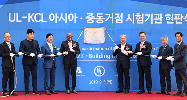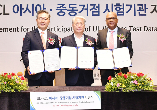 ▲삼척 실화재시험연구센터 운영 기관인 KCL(한국건설생활환경시험연구원)과 미국 안전인증기관인 UL(Underwriters Laboratories),삼척시는 3일 쏠비치 호텔&리조트에서 아시아권 화재 안전인증시험기관 인증 및 상호 이익 증진 협력을 위한 시험기관 현판식을 갖고 있다. ⓒ삼척시