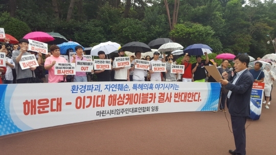 마린시티 아파트 입주자대표회 연합체인 '마린시티연합회'는 지난 8월 29일 부산 해운대 동백섬 인근에서 해상케이블카 설치 반대 집회를 열고 "공공재인 부산 앞바다가 시업에 사유화되고 동백섬과 이기대가 상업 개발로 환경이 훼손된다"고 강하게 반발했다.