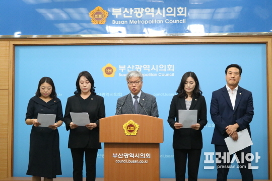 기장군의회 황운철 의장, 맹승자·우성빈·박우식 의원은 9일 부산시의회 3층 브리핑룸에서 기자회견을 열고 "기장군수와 군집행부에게 만인에게 통용되는 실제적 법과 원칙에 의거한 행정과 책임 있는 자세를 보여줄 것을 촉구한다"고 밝혔다.