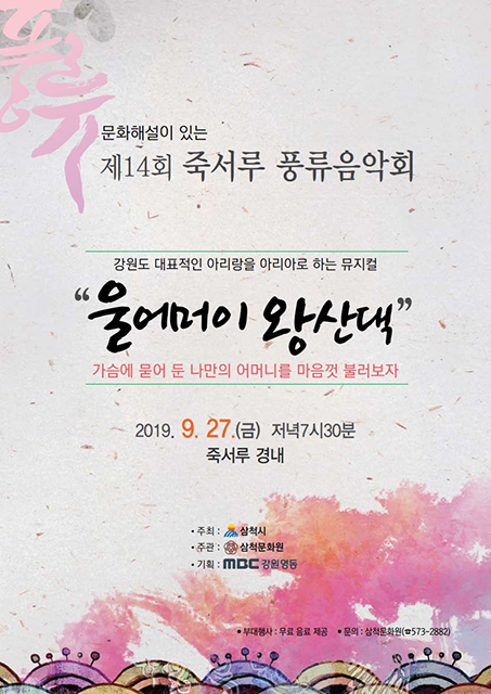 삼척시는 시를 찾는 외지 관광객 및 시민들에게 죽서루와 문화예술의 도시인 삼척을 알리고, 추억거리와 힐링을 제공하고자 오는 27일 오후 7시 30분 ‘제14회 죽서루 풍류음악회’를 개최한다.
