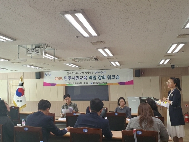 전라남도교육청(교육감 장석웅)은 20일(금) 오후 청사 5층 중회의실에서 민주시민교육 업무담당자 65명을 대상으로 ‘민주시민교육 역량 강화 워크숍’을 개최했다.