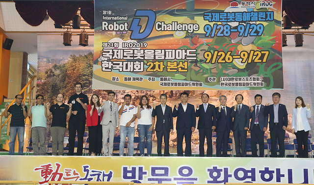 ▲지난 28일 강원 동해시 웰빙레포츠타운 내 동해체육관에서 열린 ‘제1회 국제로봇동해챌린지대회’에서 행사 관계자들이 기념촬영을 하고 있다. 올해 동해시에서 처음 주최한 국제로봇동해챌린지대회는 한국을 비롯해 태국, 방글라데시, 우즈베키스탄, 루마니아 등 5개국 100여 명의 선수가 참가해 로보스콜라, 로봇인무비, 미션형 창작 등 3개 종목 기량을 겨룬다. ⓒ동해시