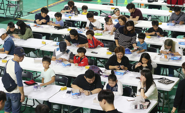 ▲지난 28일 강원 동해시 웰빙레포츠타운 내 동해체육관에서 열린 ‘제1회 국제로봇동해챌린지대회’에 참석한 어린이와 학부모들이 로봇챌린지 만들기 체험을 하고 있다. ⓒ동해시