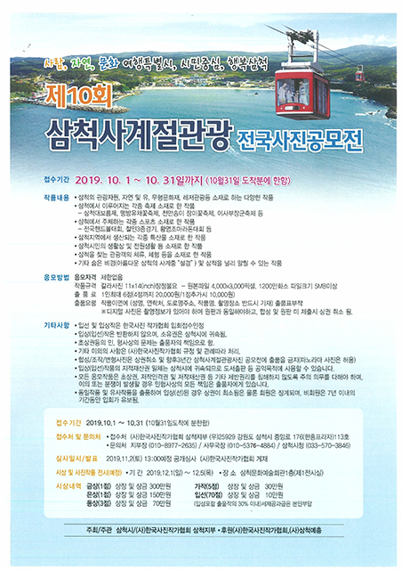 삼척시는 1일부터 31일까지 한 달간 ‘제10회 삼척사계절관광전국사진공모전’ 출품작을 접수한다고 밝혔다.