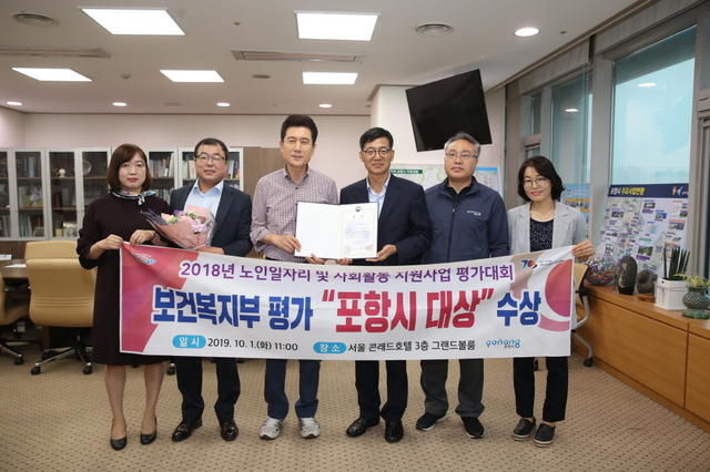 포항시는 전국 243개 지자체 중 6개 시․군․구에 수여되는 대상에 선정됐으며, 포항노인일자리창출지원센터는 인력파견형사업단 평가 대상을, 포항시니어클럽은 우수 수행기관 최우수상으로 지자체와 수행기관이 대회 최고의 성적을 거두는 겹경사를 맞았다.