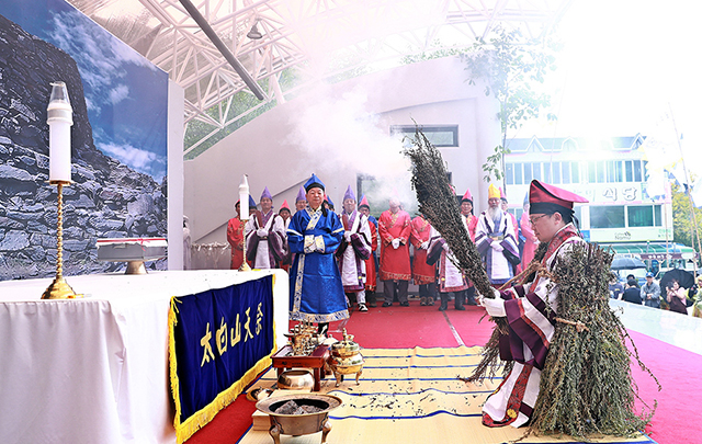 4일 태백산 천제를 주관한 태백문화원과 태백시에 따르면 18호 태풍 ‘미탁’의 영향으로 지난 3일 태백산 천제단에서 진행할 예정이었던 천제 제례를 당골광장으로 옮겨 망제 형식으로 진행했다.