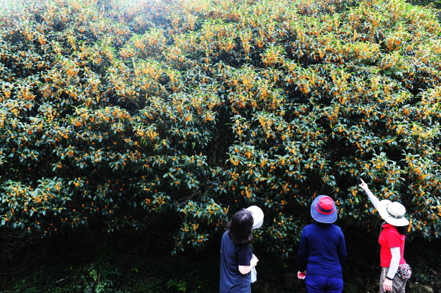 전남 완도수목원에 들어와 육림교를 지나 청운로가 시작하는 곳에 50여 그루의 금목서가 황금빛 꽃을 안고 있는 모습이 장관을 이루고 있다.