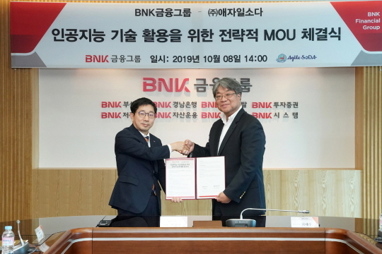 BNK금융그룹은 8일 오전 부산은행 본점에서 인공지능 역량 강화를 통한 혁신 금융서비스 제공을 위해 애자일소다와 '인공지능 기술 활용을 위한 전략적 업무협약'을 체결했다고 밝혔다.