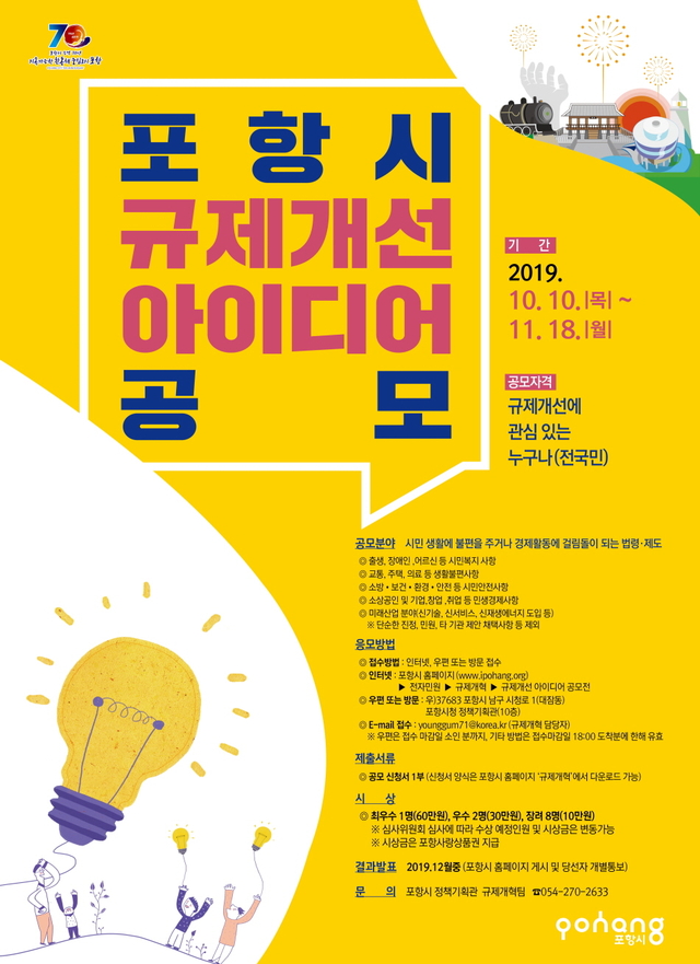 포항시가 시민의 일상생활과 경제활동에서 겪는 불합리한 행정규제를 발굴하기 위해 오는 10일부터 11월 18일까지 ‘2019 포항시 규제개선 아이디어 공모’를 진행한다.