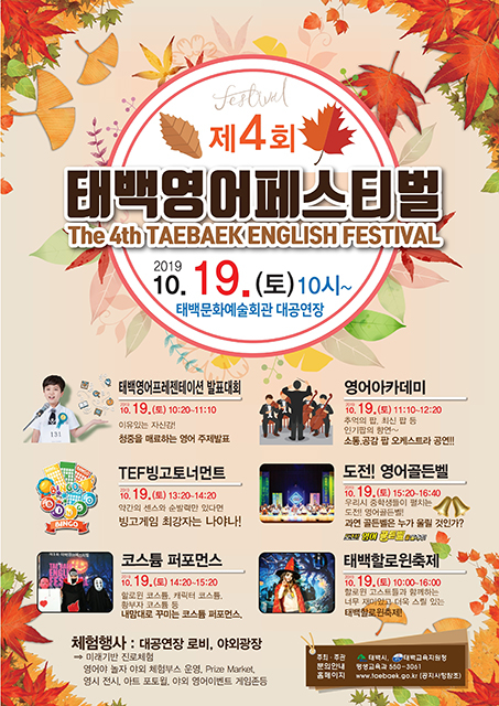 강원 태백시는 오는 19일 태백문화예술회관 일원에서 제4회 태백영어페스티벌을 개최한다고 밝혔다.