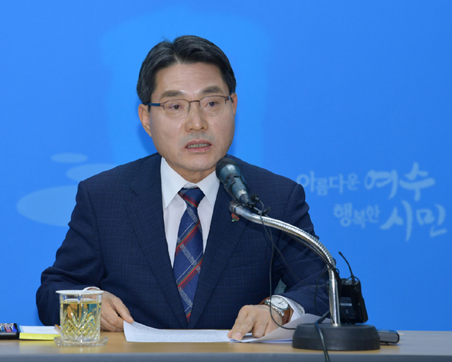▲14일 권오봉 여수시장이 여수시청 브링핑룸에서 기자간담회를 통해 국립해양기상과학관 건립을 촉구하고 있다. ⓒ여수시