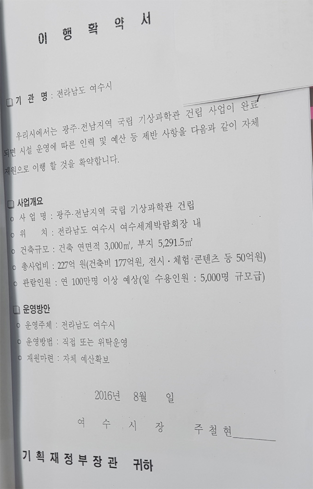 ▲지난 6기에서 해양기상과학관 자체예산확보에 대한 이행 확약서 사본이 공개됐다. ⓒ여수시