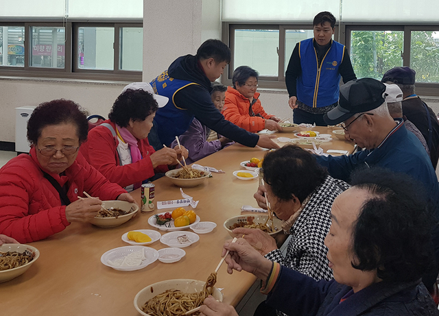 ▲국제로타리 3730지구 사북로타리클럽(회장 이상혁)은 15일 강원 정선군 사북읍 종합복지회관에서 고한 경로대학 어르신 150여 명을 초청한 가운데 지역 어르신과 함께하는 ‘사랑의 짜장면 나눔’ 봉사활동을 하고 있다. 사북로터리클럽은 매년 짜장면 나눔 봉사활동과 주거환경개선, 연탄 나눔봉사 활동을 펼치고 있다. ⓒ정선군