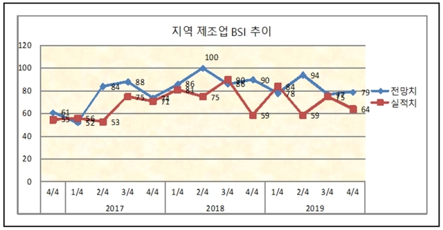 또 BSI 항목별로 수출영업이익(84), 내수매출액(83), 자금조달여건(81), 체감경기(79), 내수영업이익(75), 수출매출액(67) 항목 모두 기준치(100)미만으로 나타나 지역기업들의 어려운 현실을 반영했다.